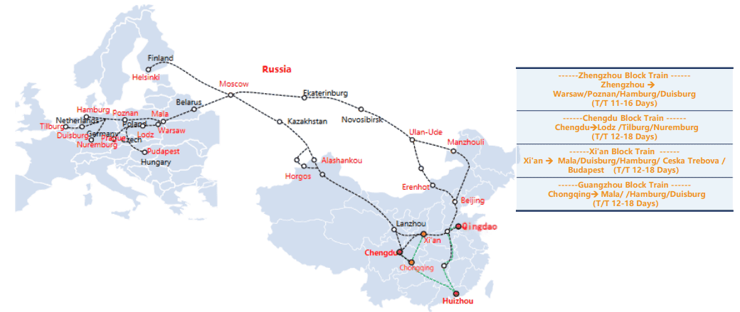大浪国际有限公司紧跟 “一带一路”步伐,与西安、成都、广州的平台公司等平台深度合作,服务范围覆盖中欧、中俄、中 亚以及东南亚等,为客户提供门到门运输服务。